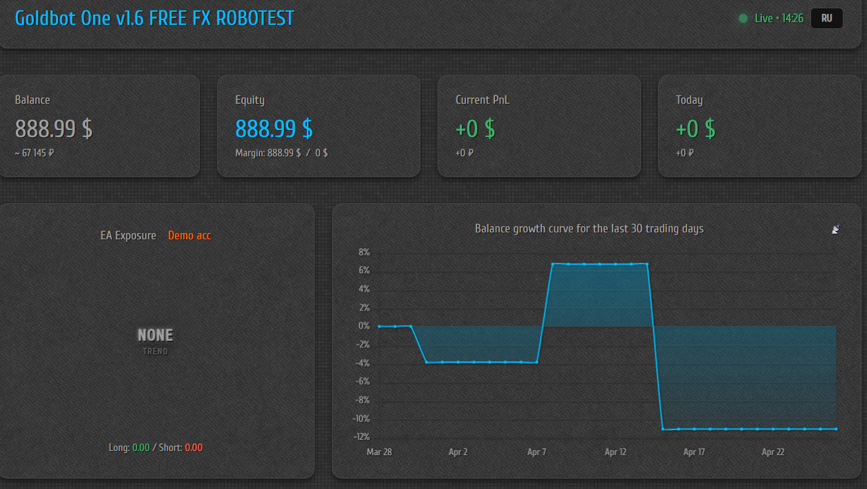 Settings: TOL_Goldbot_LowRisk_Max15DD.set (Watch the set in the WinRAR archive with the advisor)