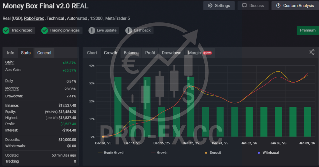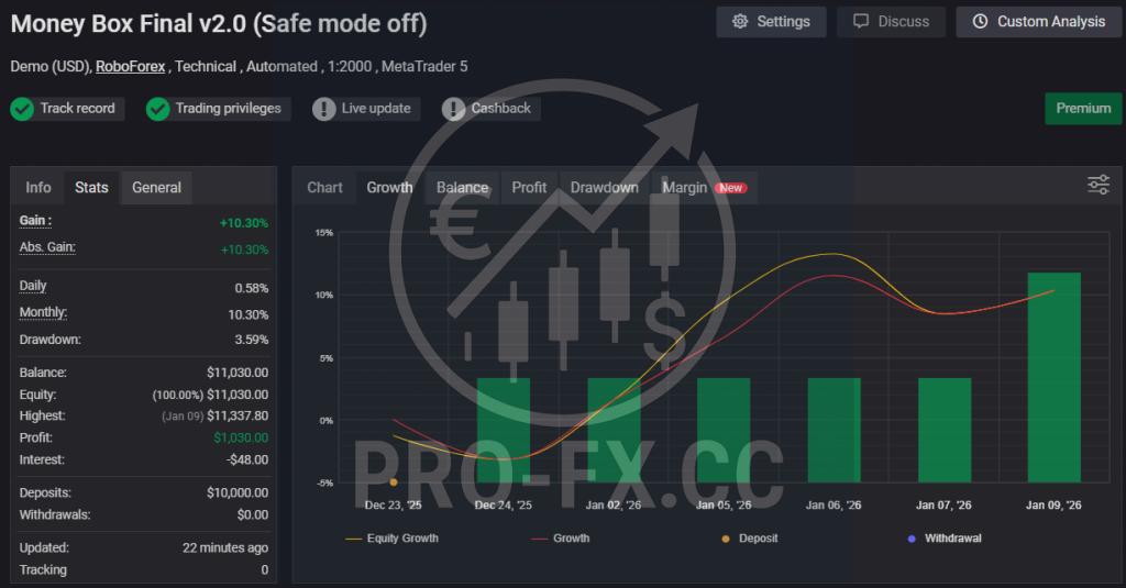 The Money Box Final v2.0 Expert Advisor uses a safe, profitable strategy over the long term.